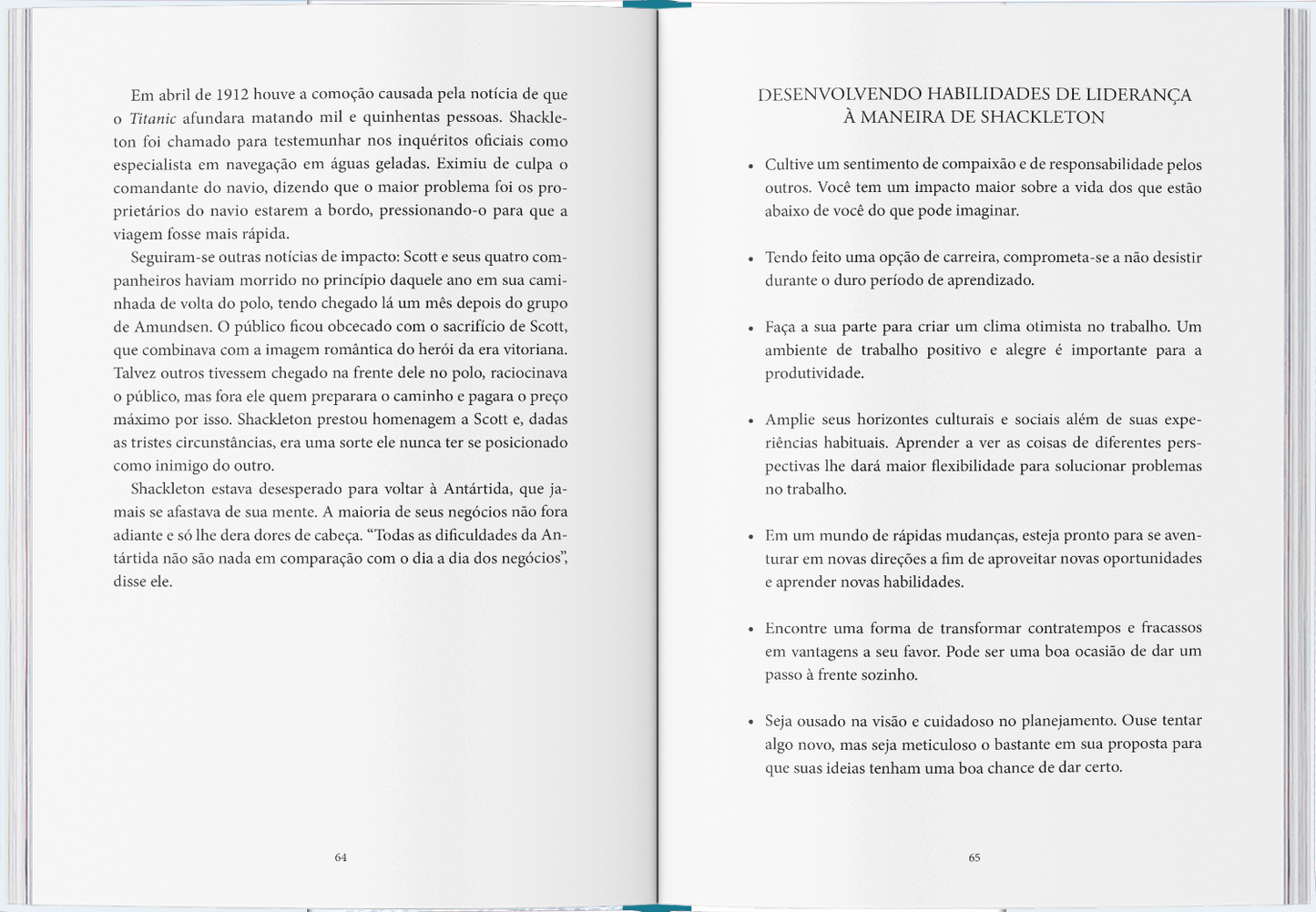 Ilustrado com lindas fotos de Frank Hurley, este livro mostra que as características de liderança de Shackleton podem ser aprendidas e aplicadas ao mundo de hoje para merecermos a lealdade e a dedicação de nossas equipes.