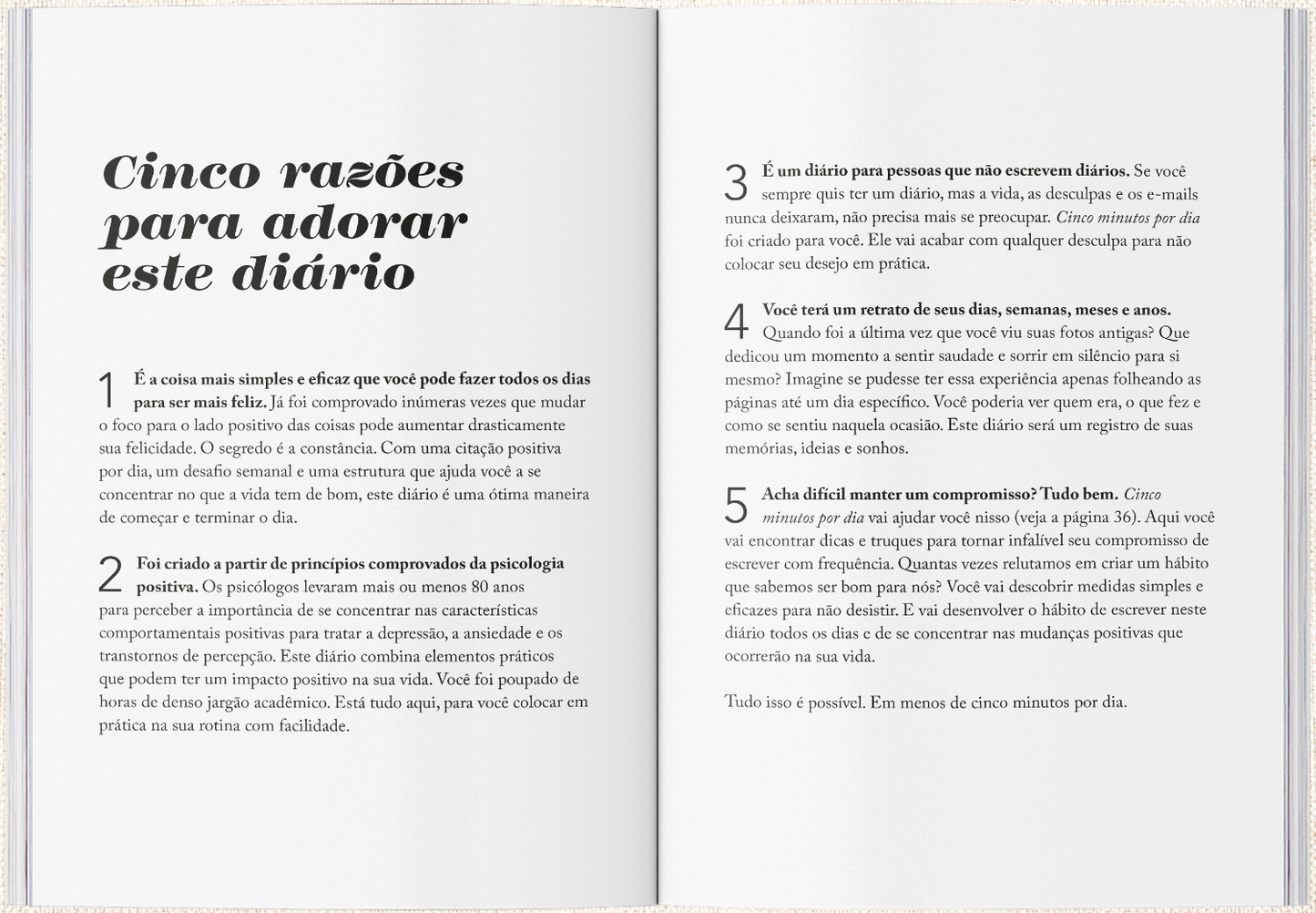 Usando a ciência da psicologia positiva para aumentar seu bem-estar, Cinco minutos por dia leva o seu foco para as coisas boas da sua vida. Ele ajudará você a cultivar a gratidão e a se livrar da negatividade.