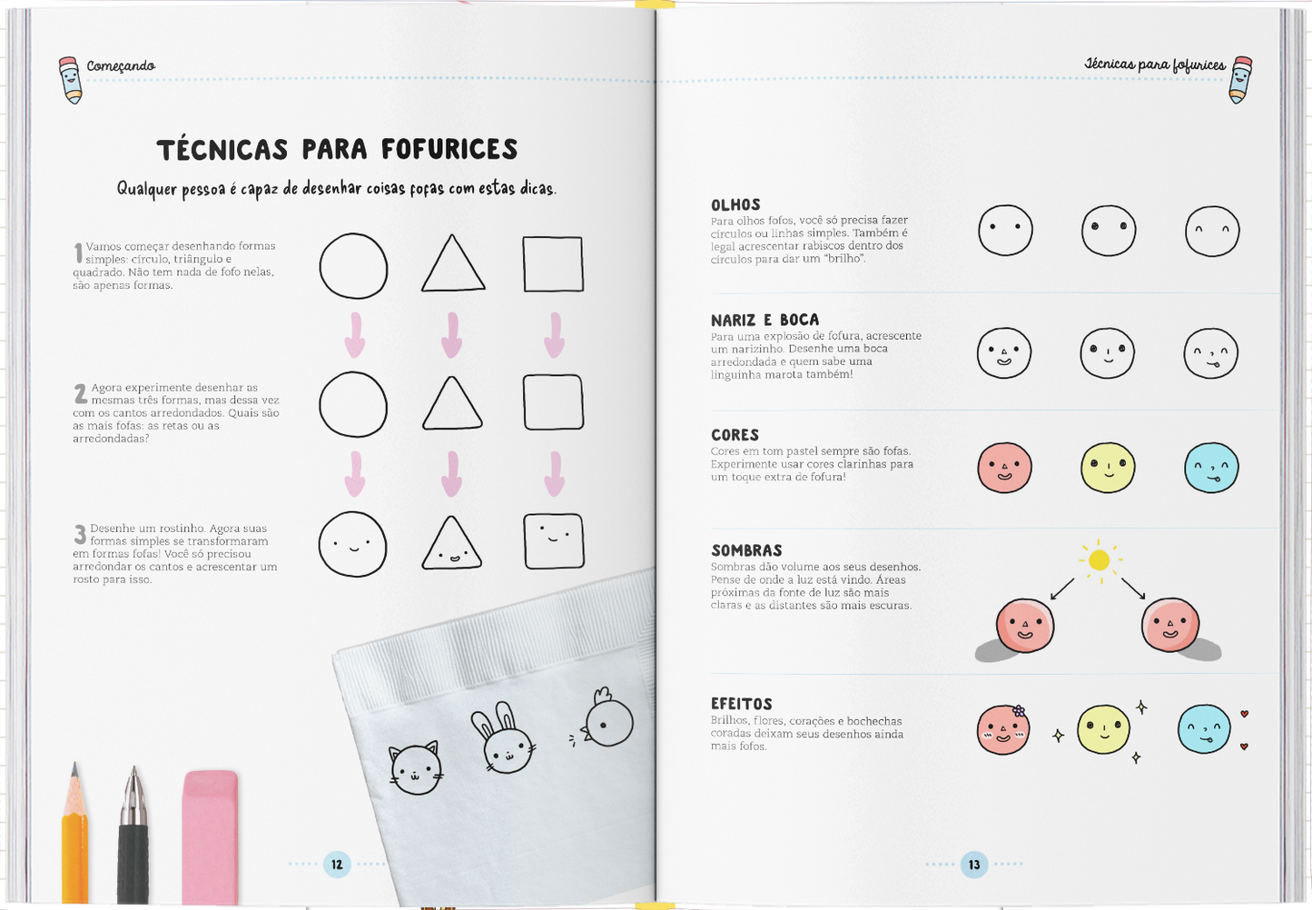 Pegue o lápis, a caneta ou os lápis de cor e siga o passo a passo para desenhar fofurices de todos os tipos.