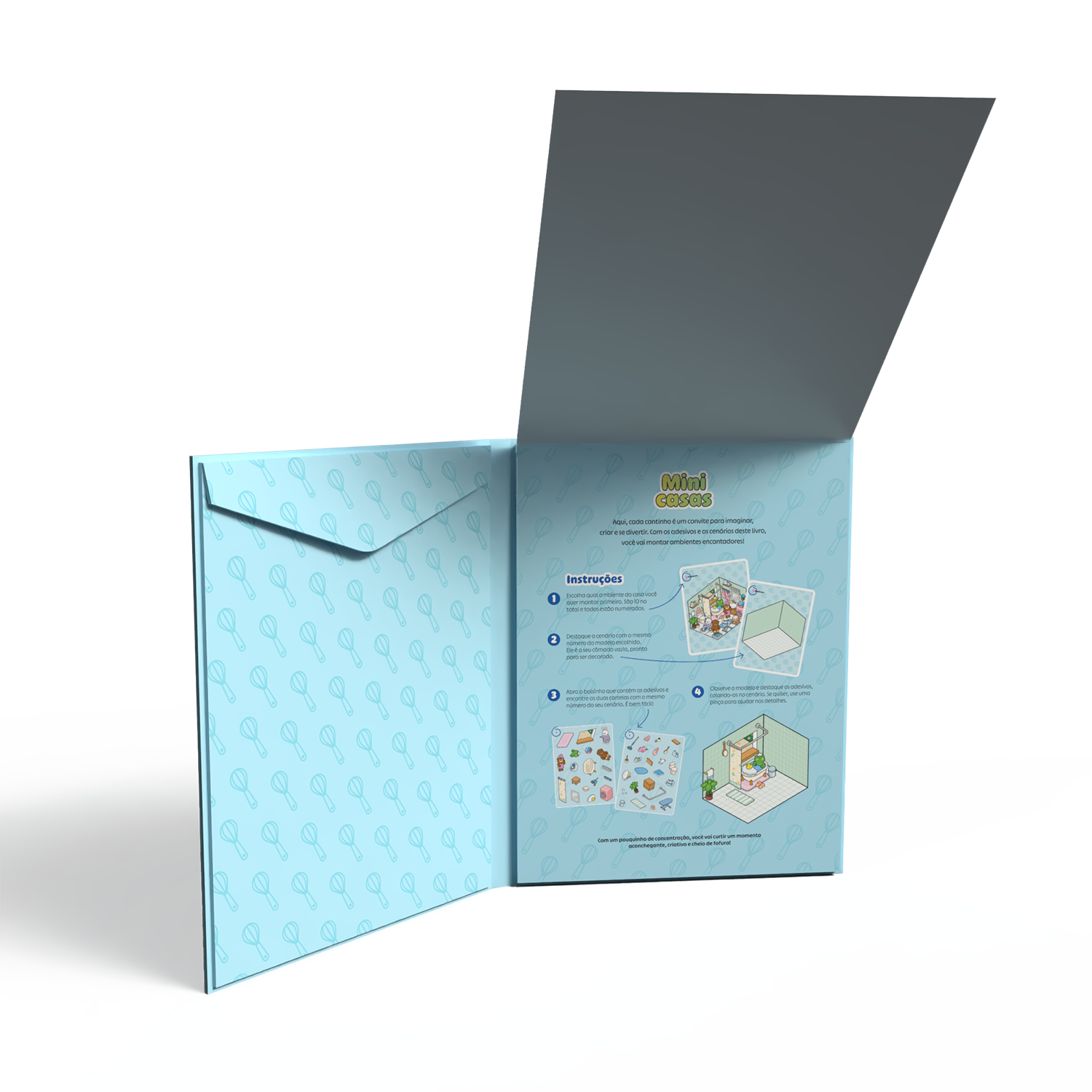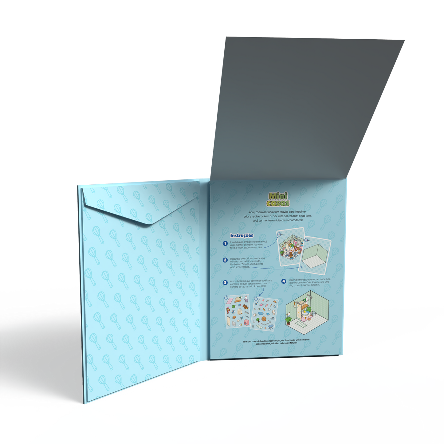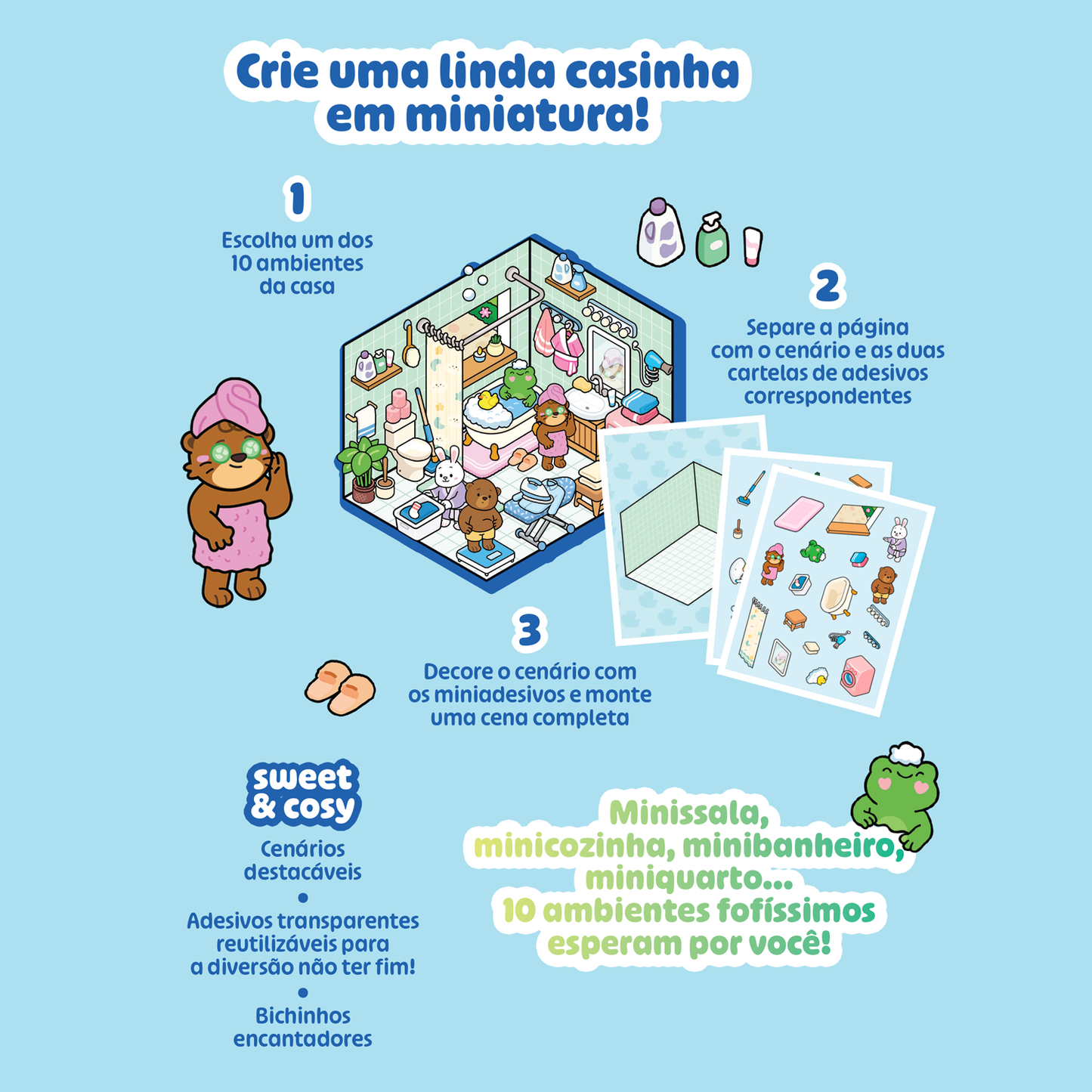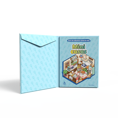 Entre em um mundo de charme em miniatura com Mini casas – Livro de adesivos sweet & cosy, que traz 10 ambientes aconchegantes e encantadores para você decorar.